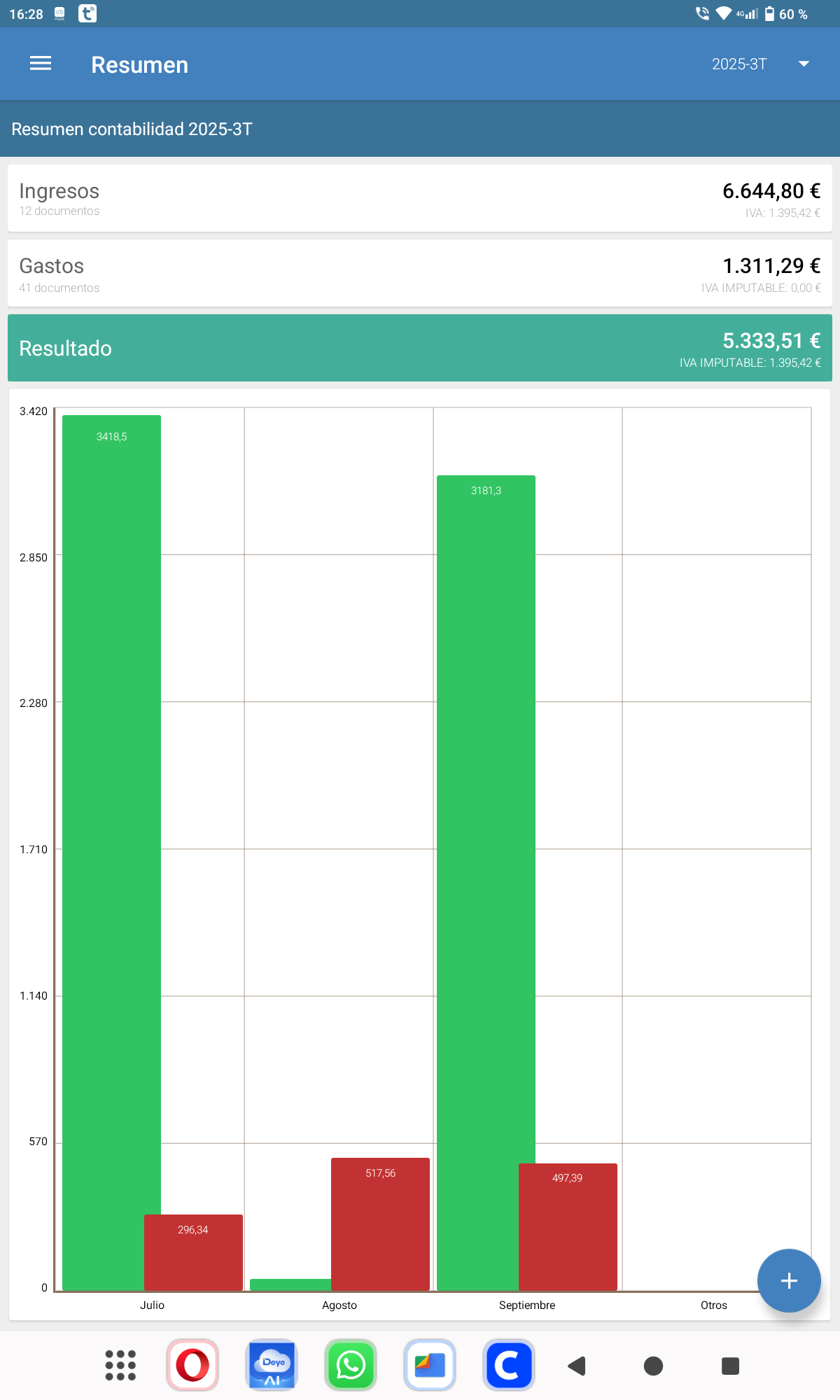 Buenos días, Diego. El resultado del trimestre es: pago a cuenta: 805,24€ e IVA: 1.077,26 €. Total: 1882,5€ A pagar.