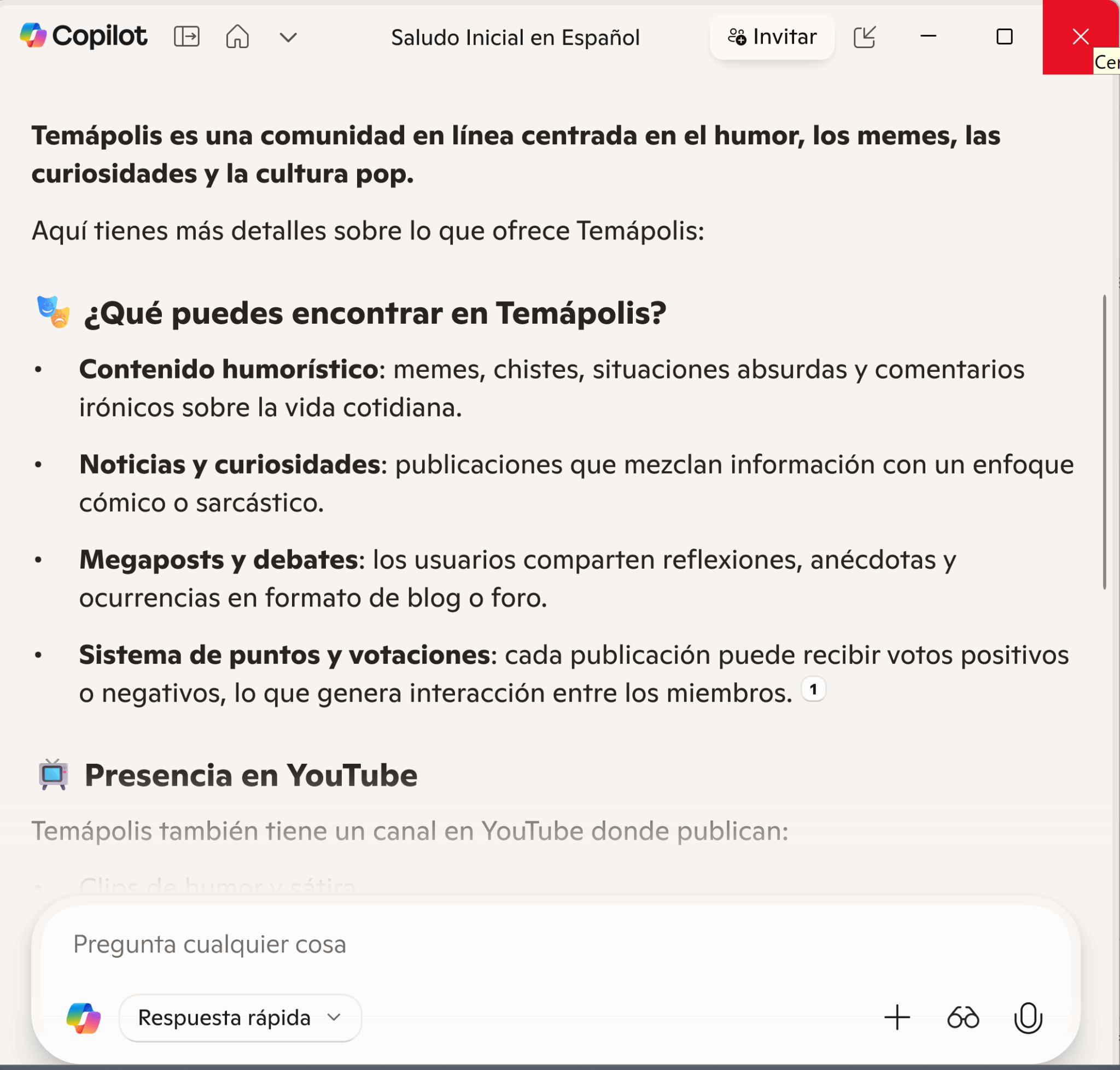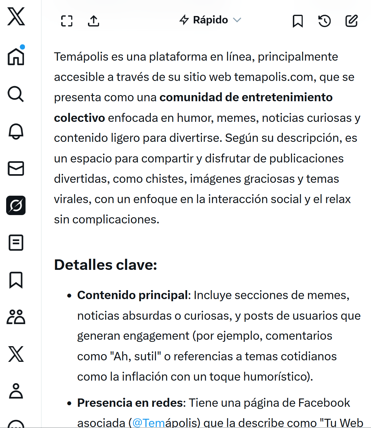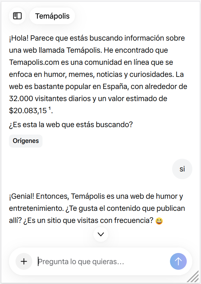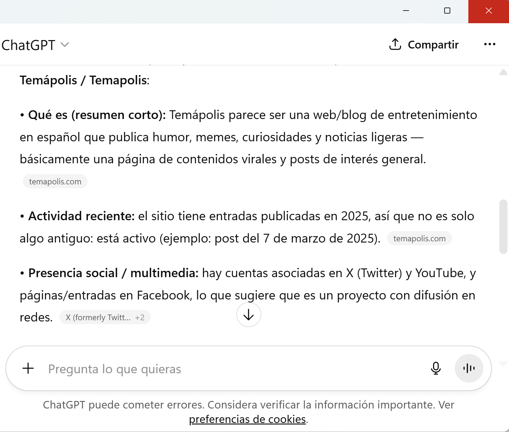 ¿Qué saben las IA de nosotros? Las IA se han convertido en la nueva Wikipedia de esta generación, así que veamos qué saben las Inteligencias Artificiales mas populares sobre Temápolis: Este le atinó bastante Esta IA se mete algo muy fuerte Nada mal Así nos ven las IA ⚆_⚆ Vota este post:12345678910Total de puntos: 0+10 Temápolis